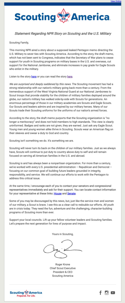 But apparently Pete Hegseth’s DoD is less enthused. The stated rationale for withdrawing support is that scouting has abandoned “meritocracy”. A word about that. I don’t speak for Scouting America and don’t mean to contradict its chairman’s statement. But to me, scouting has never been a meritocracy. Meritocracy is about identifying and elevating the most talented, and leaving the rest to go find something else to do.